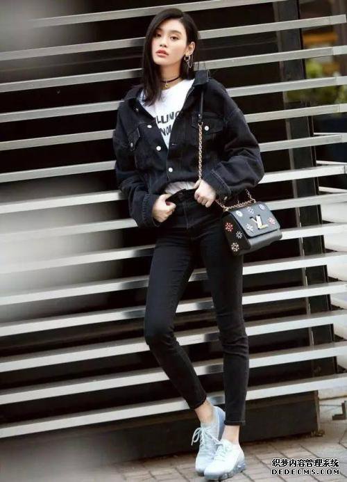 蒙蒙穿着牛仔裤和黑色奢华外套“走秀”在姚机