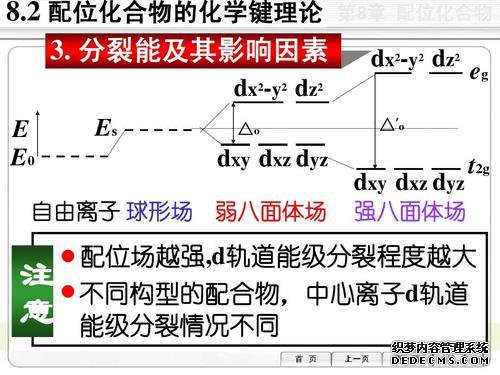 第四章晶体场,分子轨道理论八面体d轨道场d轨道d轨道八面体场中的d轨道能级分为Oh场。您可以找到八面体场的d轨道和d轨道方向的示意图,其中dz2和dx2-y2轨道非常大。